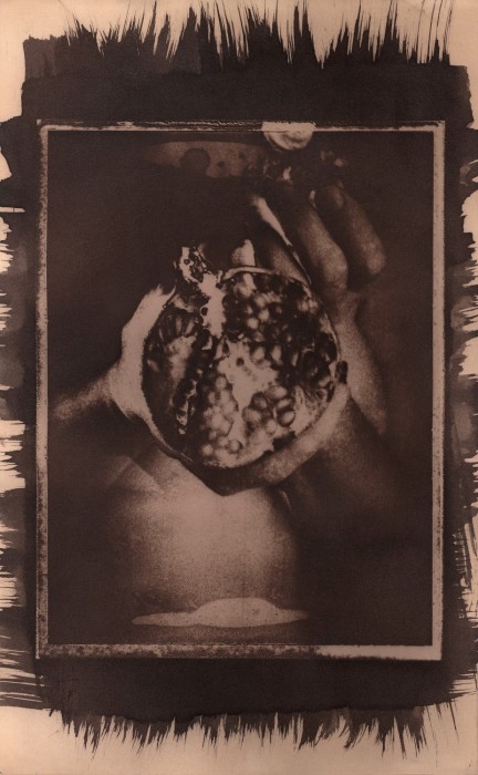 Cyanotype print on watercolor paper, tea toned. tags: cyanotypeprintwatercolor papertea tonedbrownpomegranate