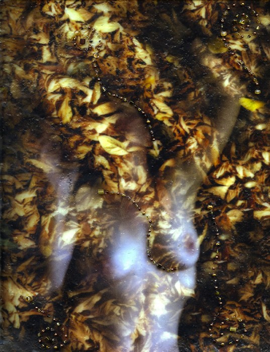 photo on goyu paper, dipped in encaustic medium, glass bead embellishment tags: photo encausticbeadworkautumn